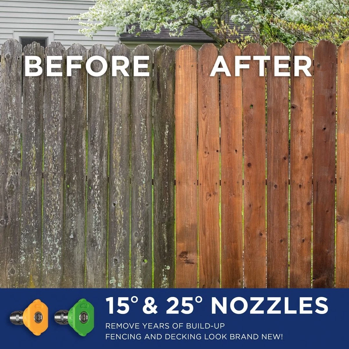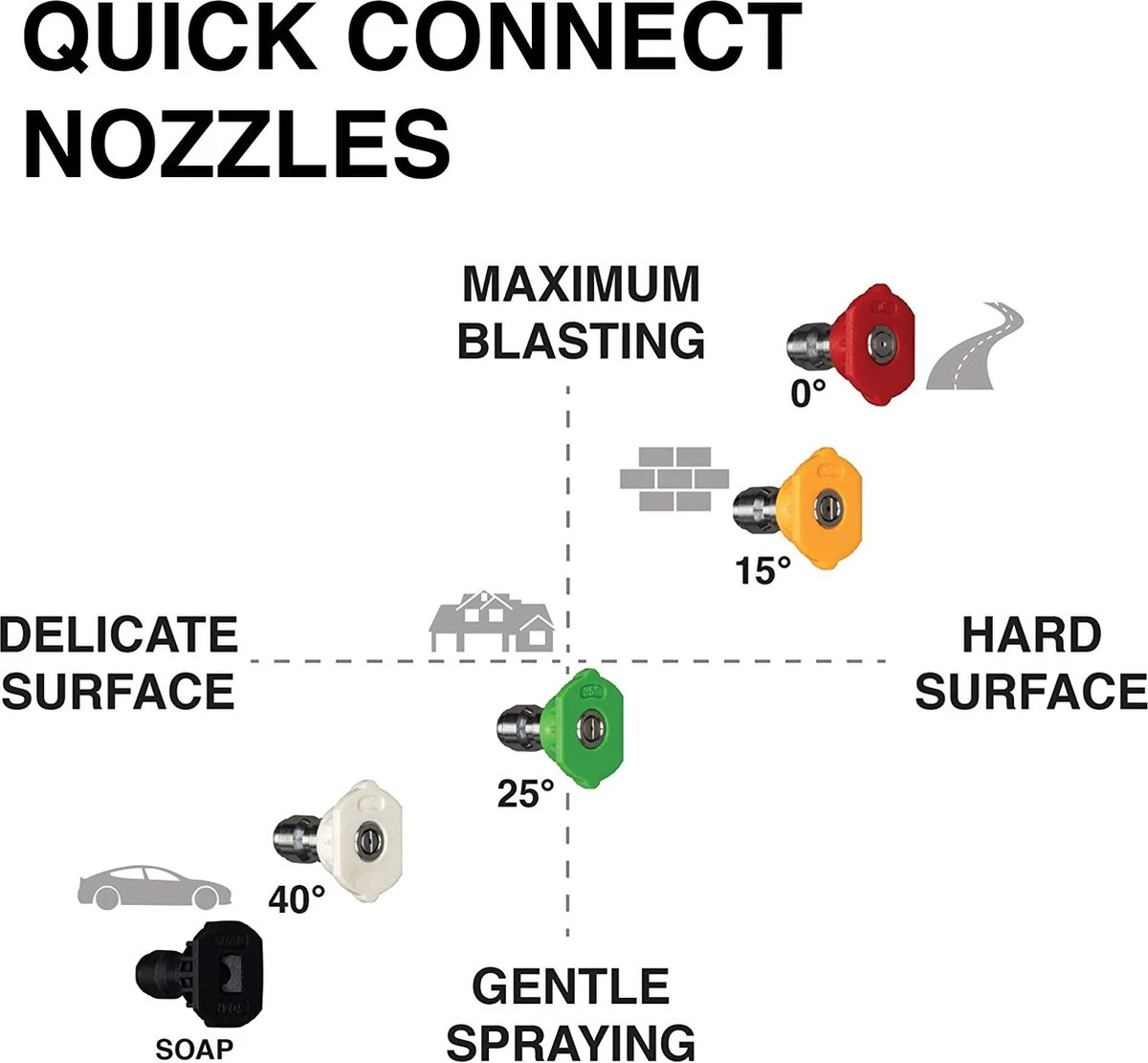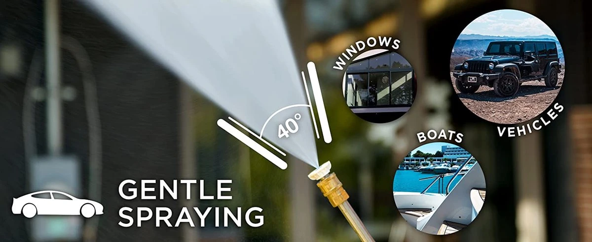 - Nozzle-assortiment: 0°, 15°, 25°, 40°, en zeep