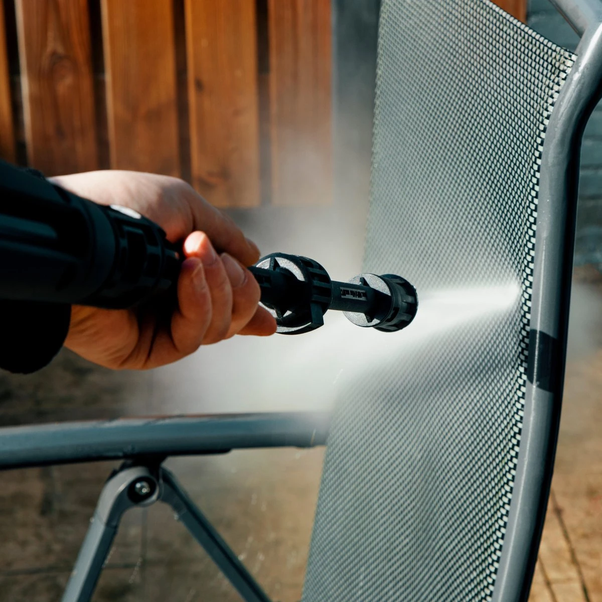 - Het schoonspuiten van kleine terrassen, schutting, tuingereedschap, tuinmeubelen en zwembad
